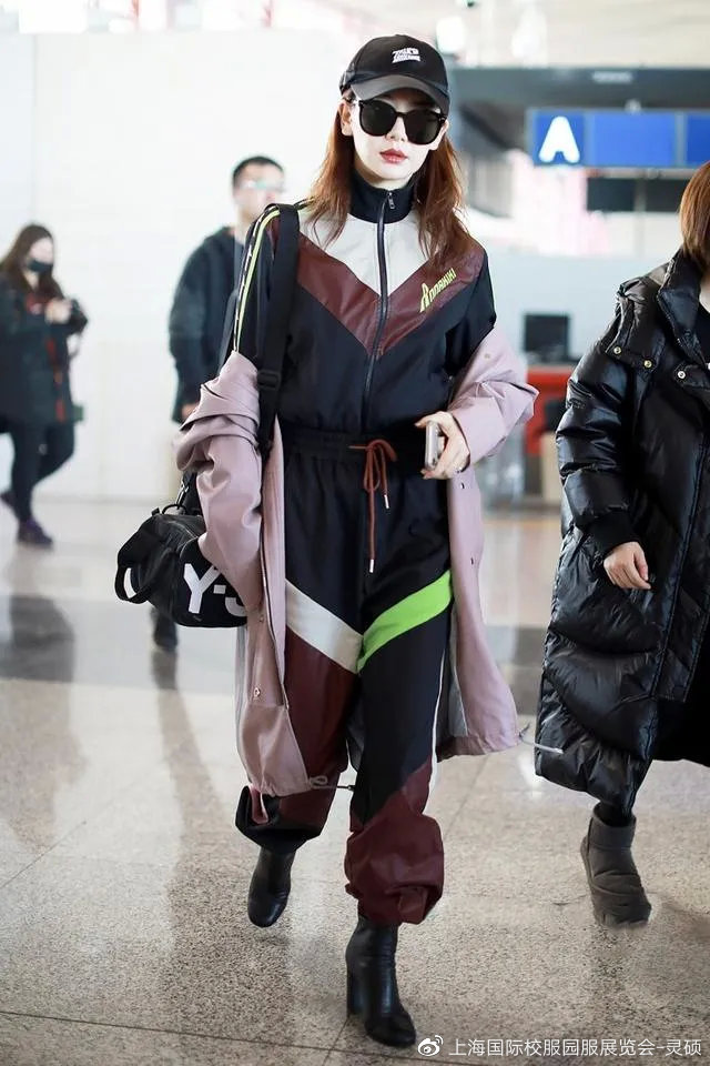纯色系的校服套装想要穿出时尚感,需要一定的外力支持,比如利用鸭舌帽、太阳镜或包包等时尚单品来加强时尚度。或者我们也可以像欧阳娜娜这样选择带有红色装饰黑色T恤搭配暗红色校服装,既增加了穿搭的层次感,又让内外穿搭有一定的呼应性,十分聪明。
