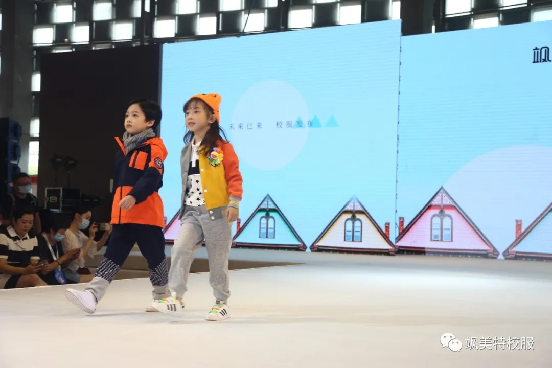 走秀开始,飒美特小模特们身着品牌校服一一走来,聚光灯下,他们将青春的自信融于每一个笑容,将满身的朝气凝聚在身上的校服里。