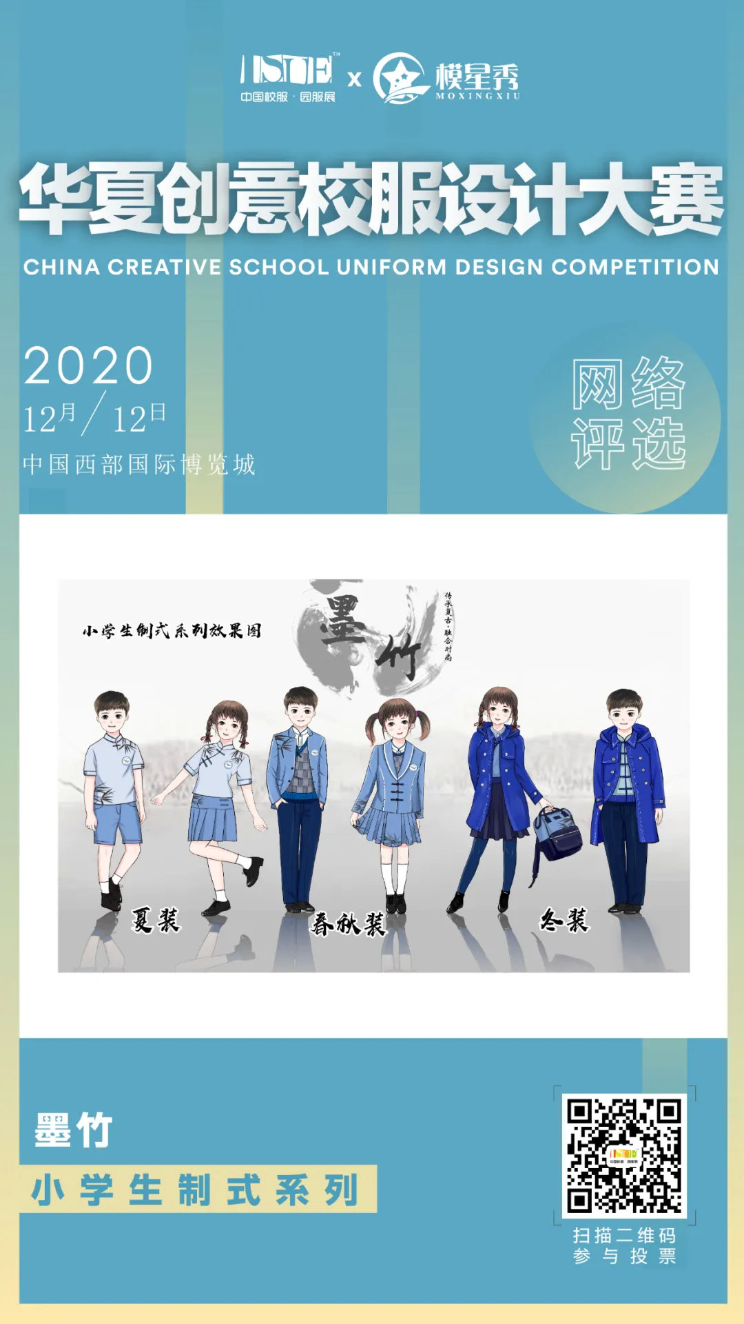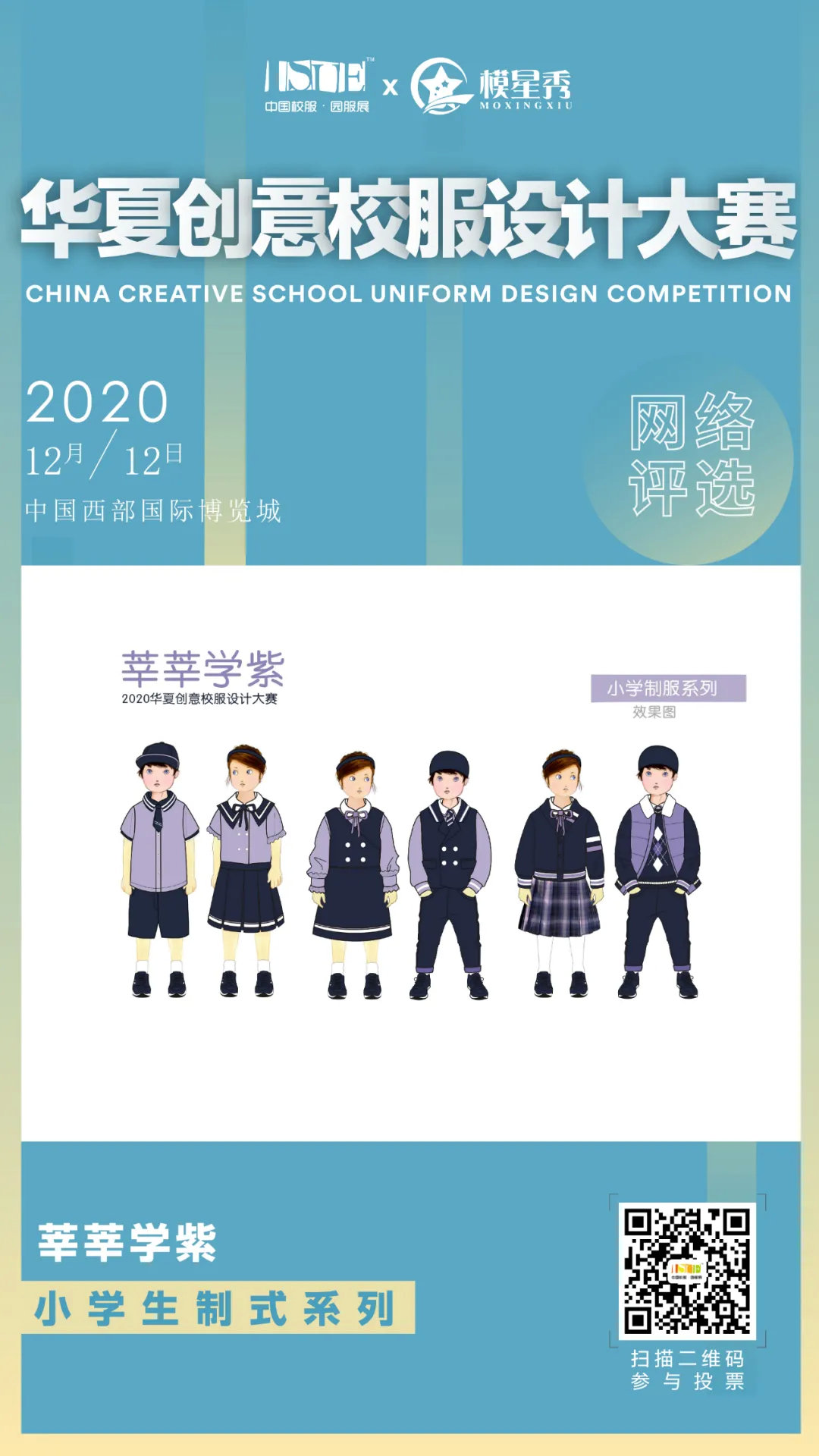 看了这么多作品,有没有被哪个圈粉呐!扫描二维码参与投票,选出你最爱的作品,也可以查看更多,不同系列的设计作品,提前走进这场校服文化与校园文化的碰撞盛会。