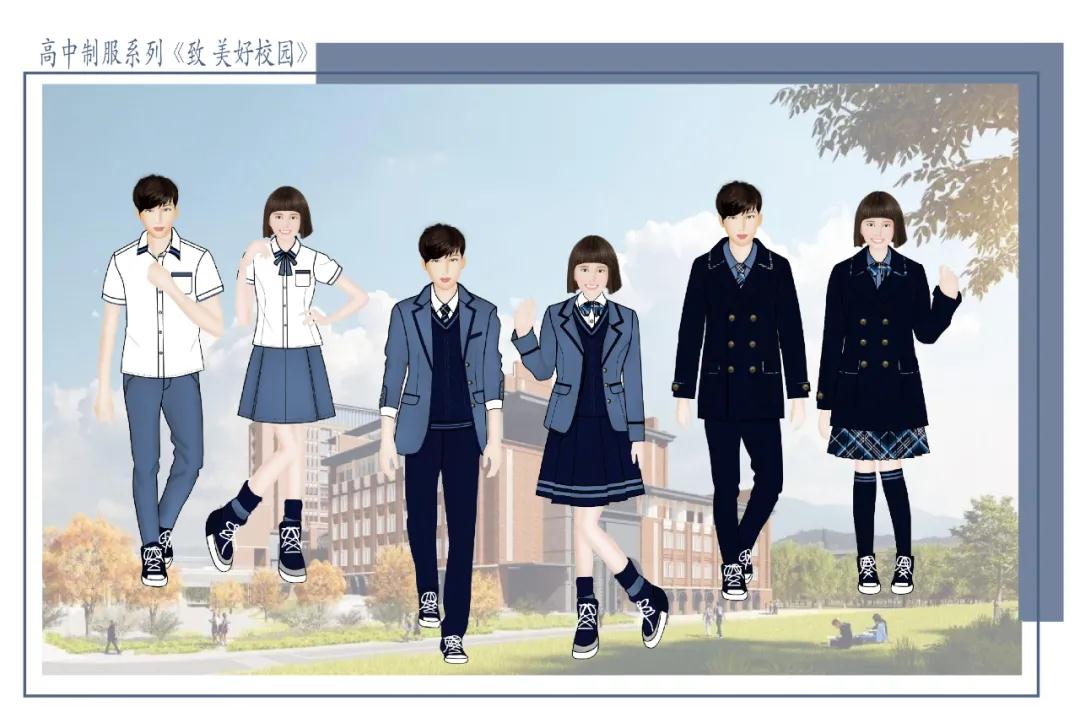 款式设计来源于"蔚蓝的天空",用色彩上的协调手法,展现出一派简约、优雅的风范。而天空象征着清新、向往、遐想、翱翔,学生需要这样的气息,不停向着梦想的地方飞翔。整体色彩选用灰蓝色、白色、藏青色、格子色调。