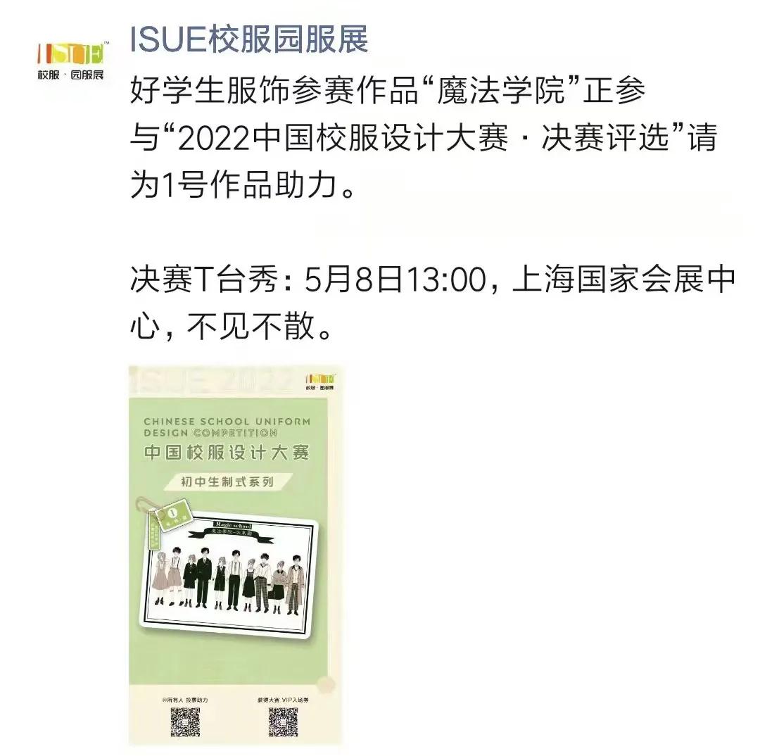 好学生服饰参赛作品“魔法学院”正参与“2022中国校服设计大赛·决赛评选”请为1号作品助力。决赛T台秀:5月8日13:00,上海国家会展中心,不见不散。